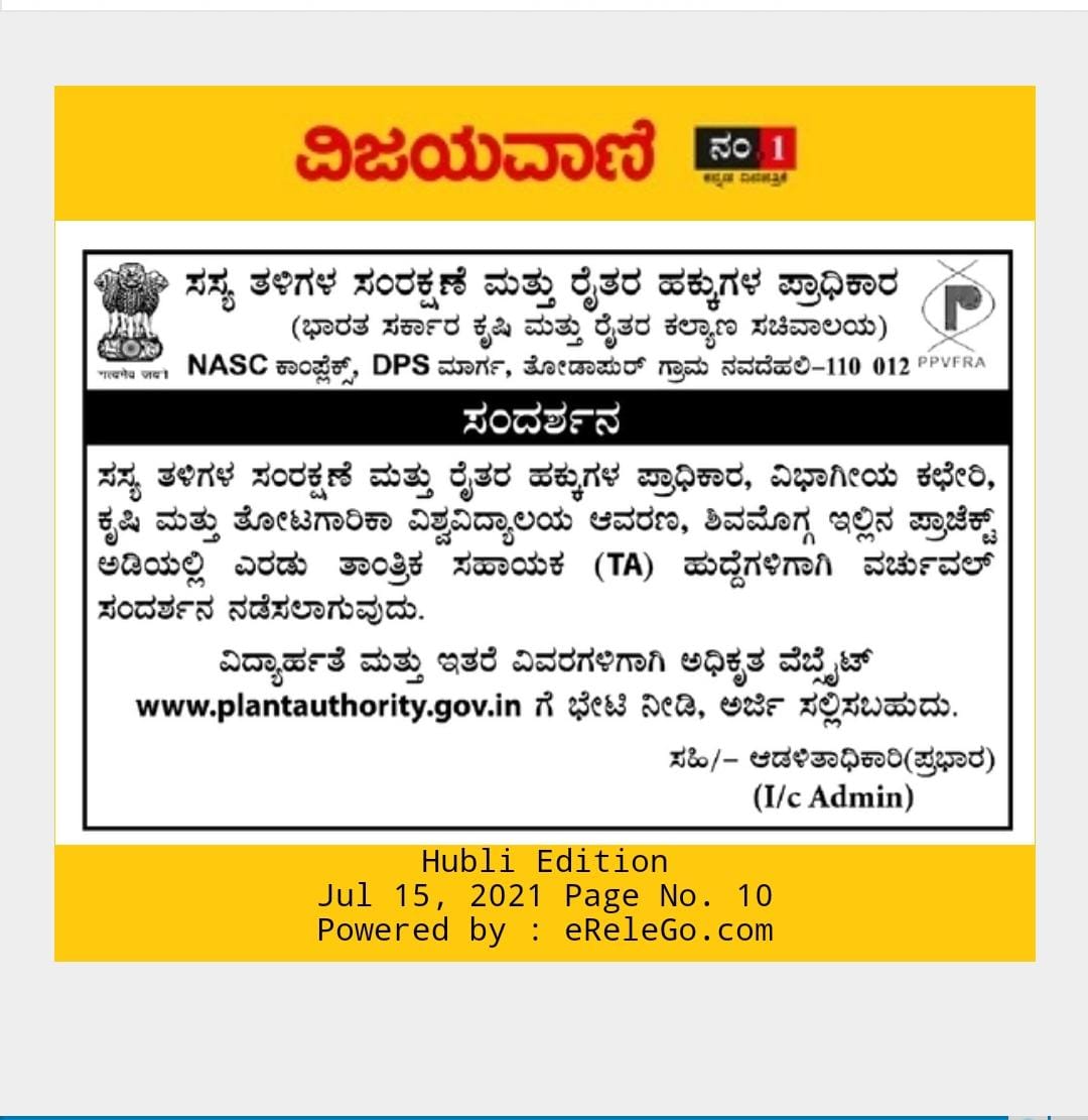 | View / Download | Advt. for the positions of Technical Assistant (TA) at PPV&FR Authority, Branch office Shivamogga, Karnataka - File size: 19.28 KB Advt. for the positions of Technical Assistant (TA) at PPV&FR Authority, Branch office Shivamogga, Karnataka - |